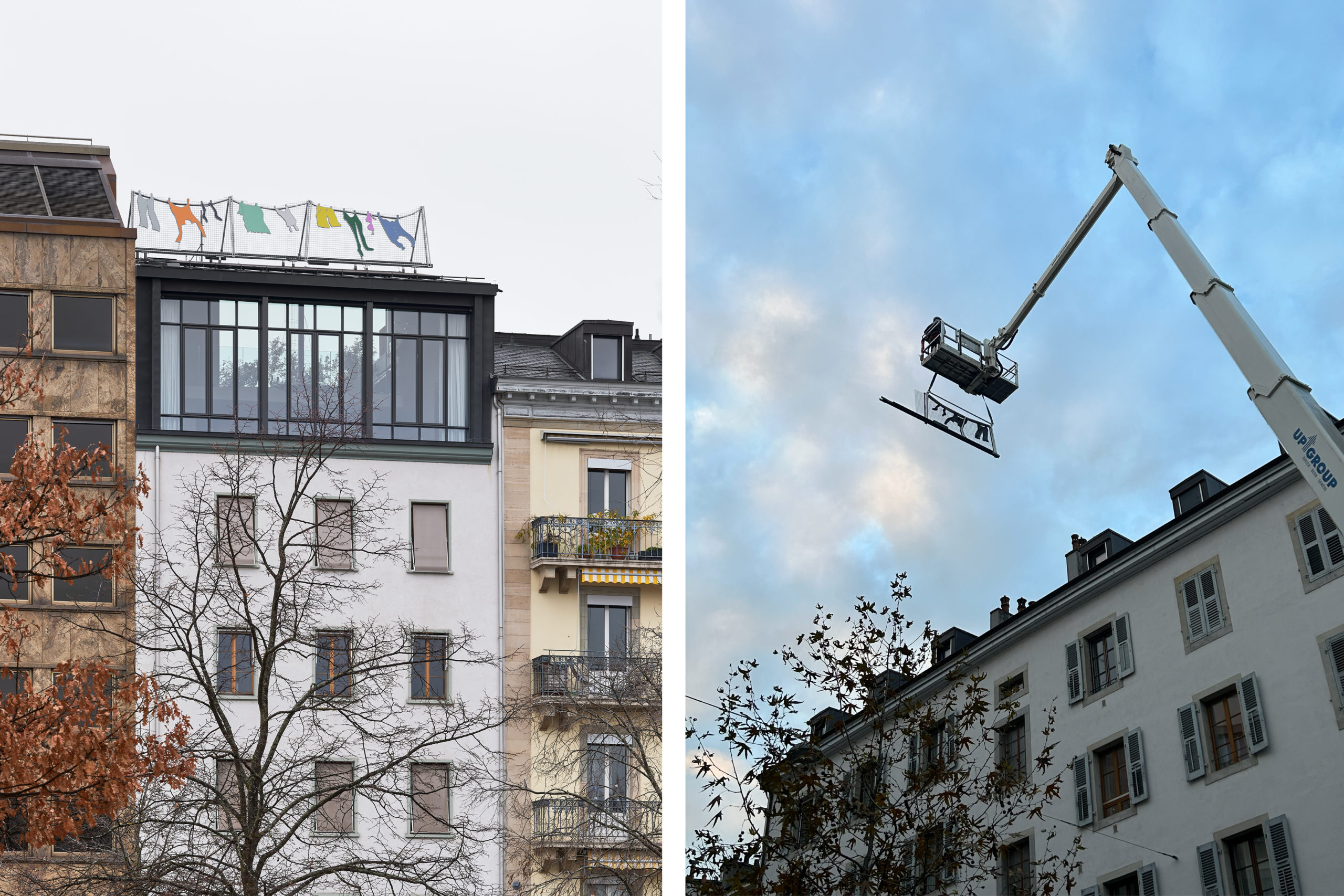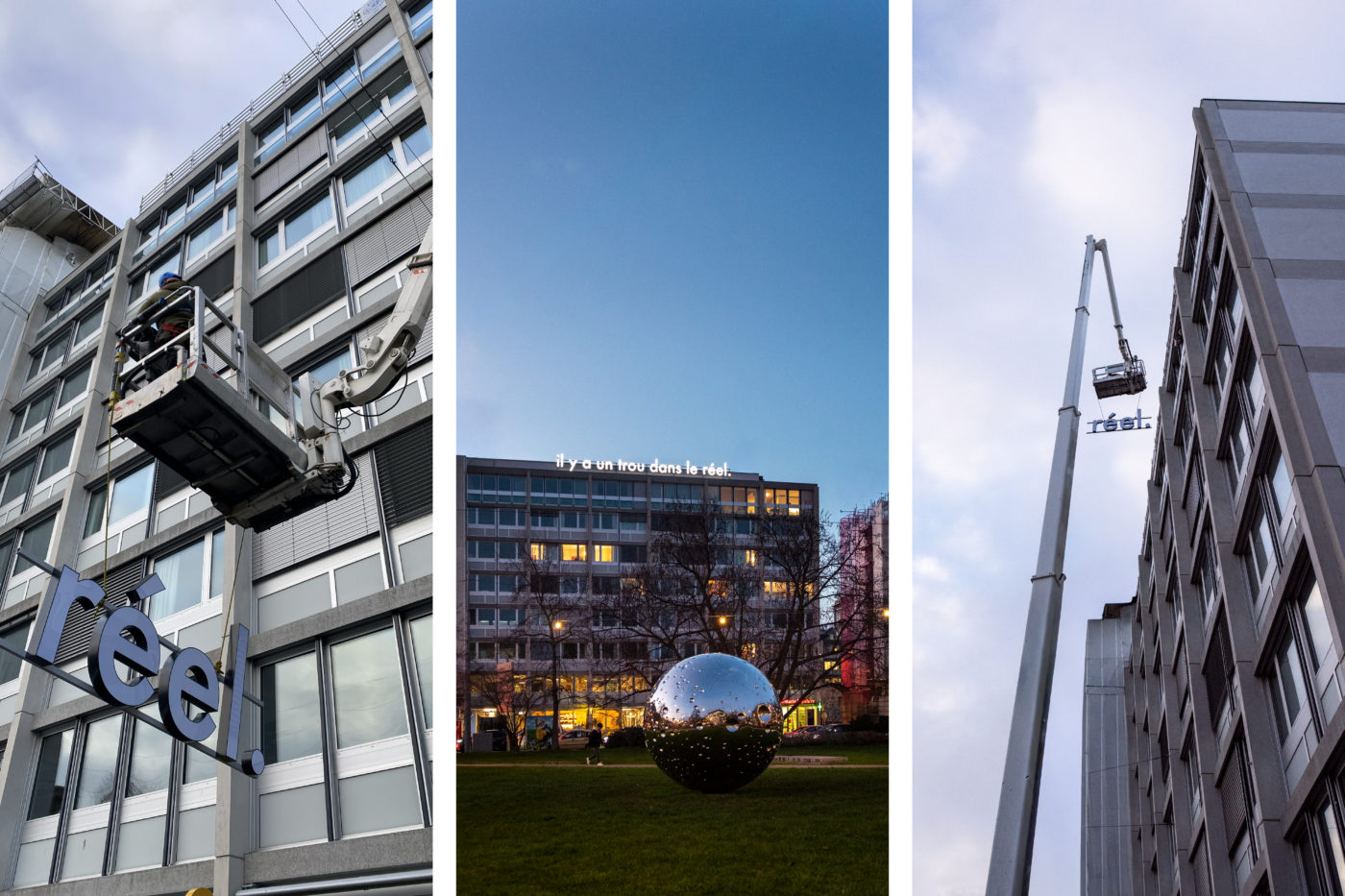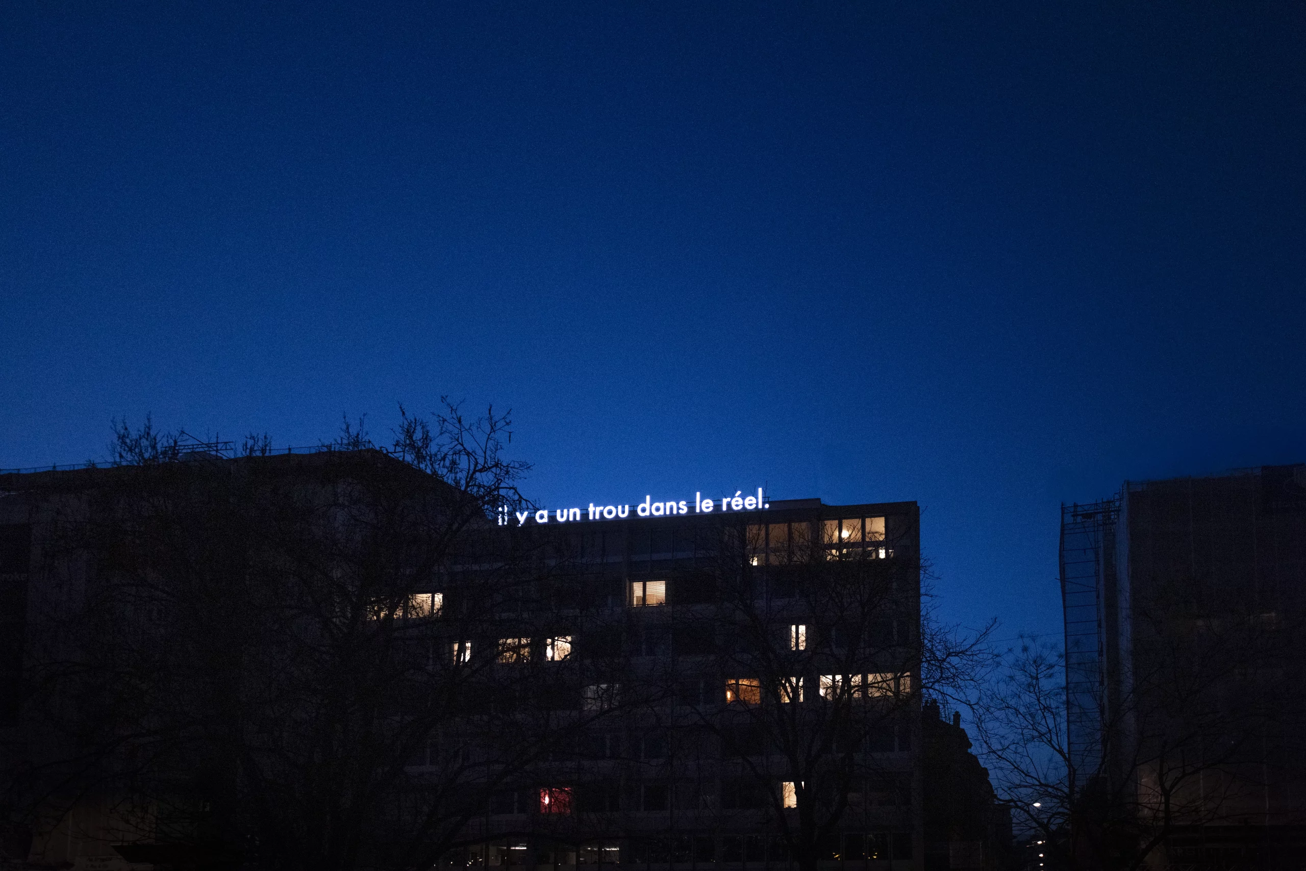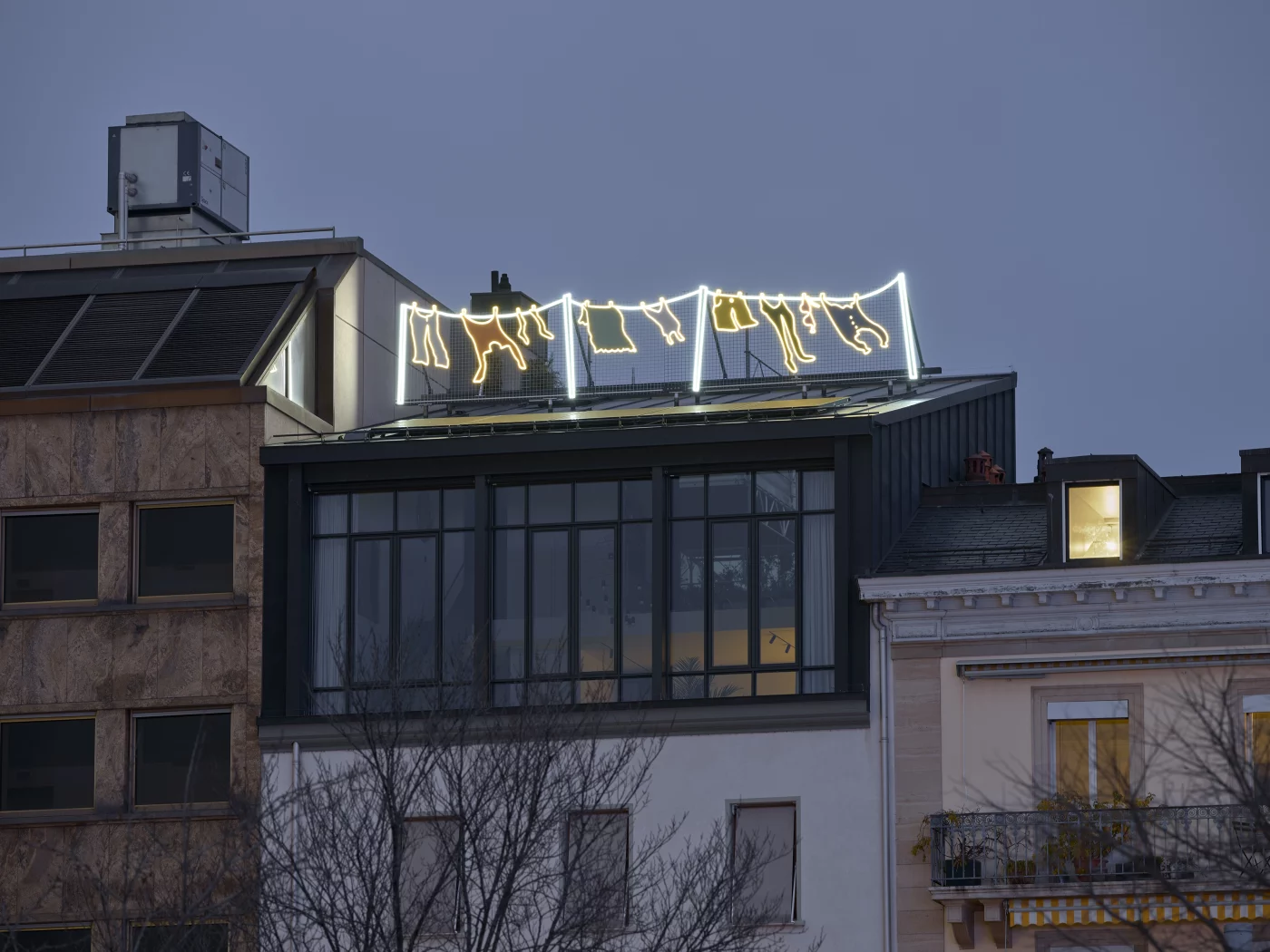 Neon Parallax est un projet d’art public initié en 2006 par les Fonds d’art contemporain de la Ville de Genève (FMAC) et du Canton de Genève (FCAC). Il établit un dialogue lumineux entre la rade et la Plaine de Plainpalais en transformant d’anciens dispositifs publicitaires en installations artistiques implantées sur les toitures genevoises.